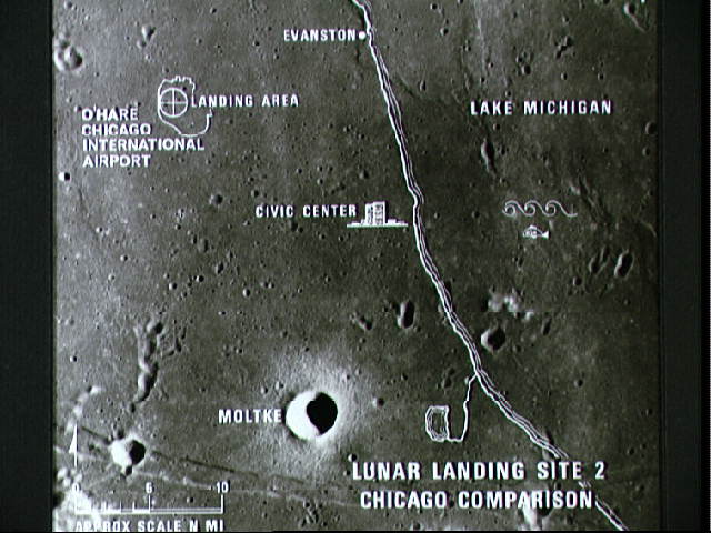 A photographic illustration comparing the size of Apollo Landing Site 2