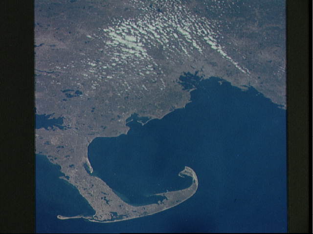 This great overall view of the Atlantic coastline of Massachusetts clearly shows why Cape Cod (42.0N, 70.5W) is one of the most easily recognized features on Earth