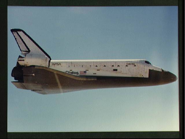 The Space Shuttle orbiter Columbia approaches its dry lake bed landing site at Edwards Air Force Base southern California at end of STS-1 flight