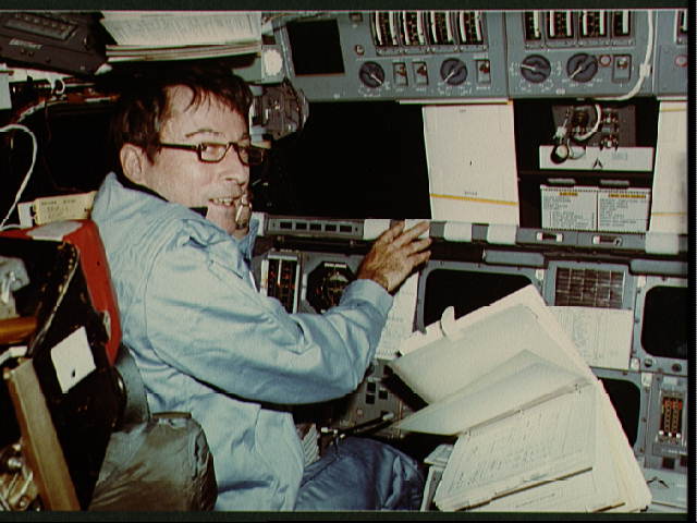 during the STS-1 mission. Commander John W. Young mans the commander's