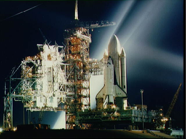 STS-1 Columbia on pad showered with lights in a night time preparation for a Flight Readiness Firing (FRF) at Launch Pad 39A at the Kennedy Space Center.